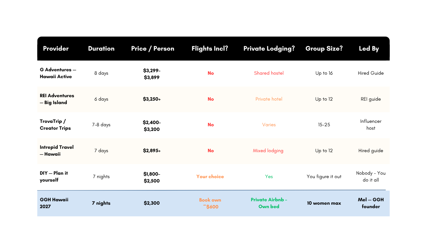 Let's talk about value — because $2,300 is real money and you deserve to know exactly what you're getting. Here's how GGH Hawaii stacks up against every other way to do a trip like this.